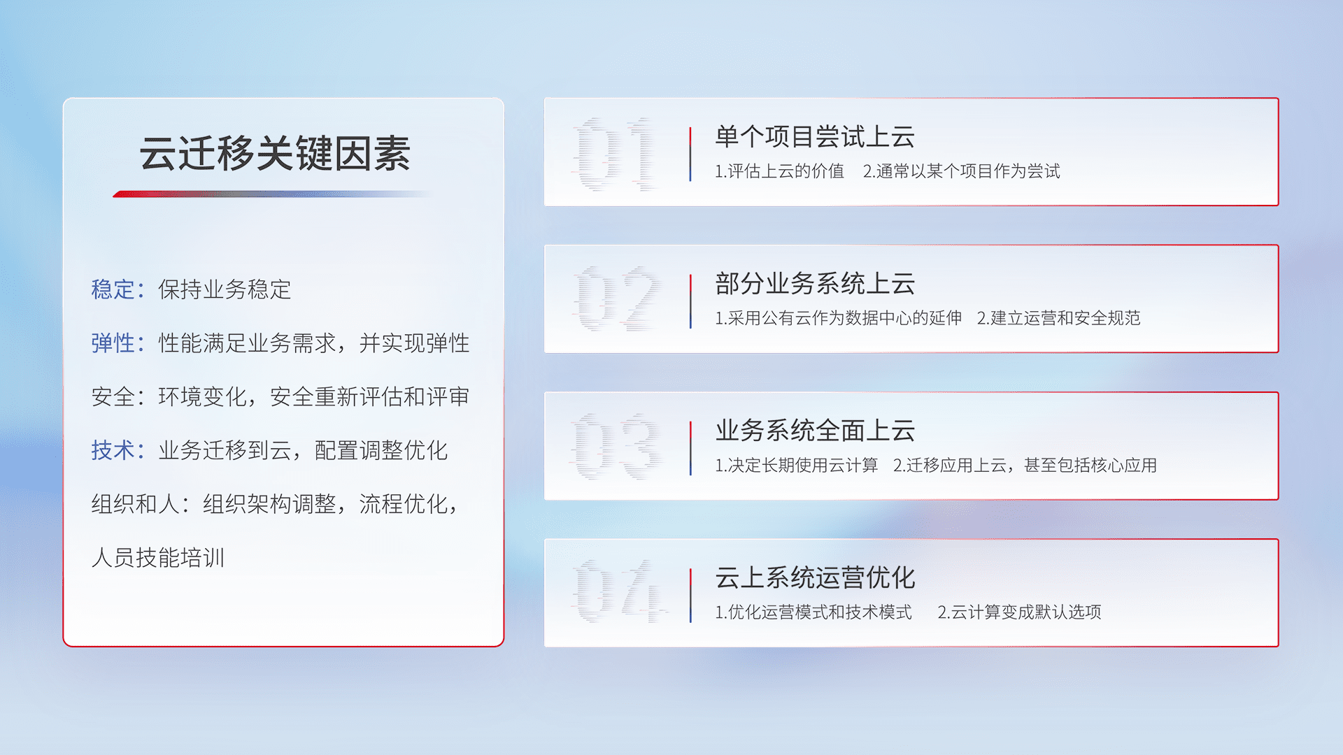 结合实际业务,,,从规划设计、、云平台选型、、、云原生改造、、数据迁移、、、、集成交付,,,,迁移全过程为客户识别最佳上云路径,,,,做好风险识别管理,,,,设计网络架构、、身份权限、、、、安全审计合规、、操作审计、、日志审计、、、、监控告警策略、、、、多站点容灾设计等,,,对云上基础设施进行整体规划,,,提升IT治理水平,,,,以满足弹性、、、高可用、、、高性能的需求。。